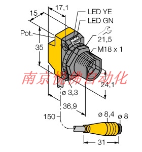 M8 4針針座帶150mmPVC線纜 防護(hù)等級(jí)IP67 LED燈全角度可見(jiàn) 通過(guò)電位計(jì)可調(diào)節(jié)靈敏度 工作電壓:10…30 VDC NPN開(kāi)關(guān)量輸出,單刀雙擲